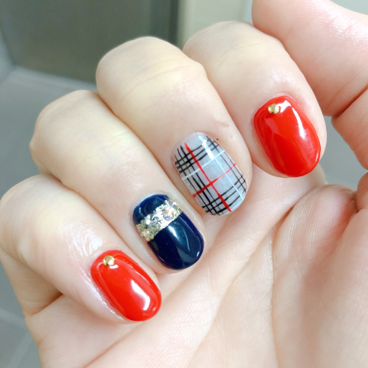 赤 紺 チェック柄ネイル O O ティアラ倉敷店